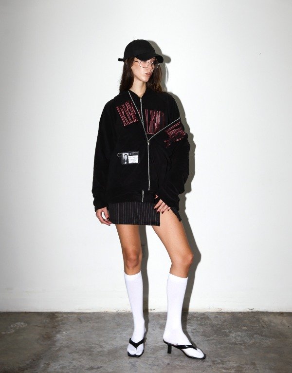Campera deportiva suave con cierre. Lleva mangas ranglán, capucha grande y bordado al frente.